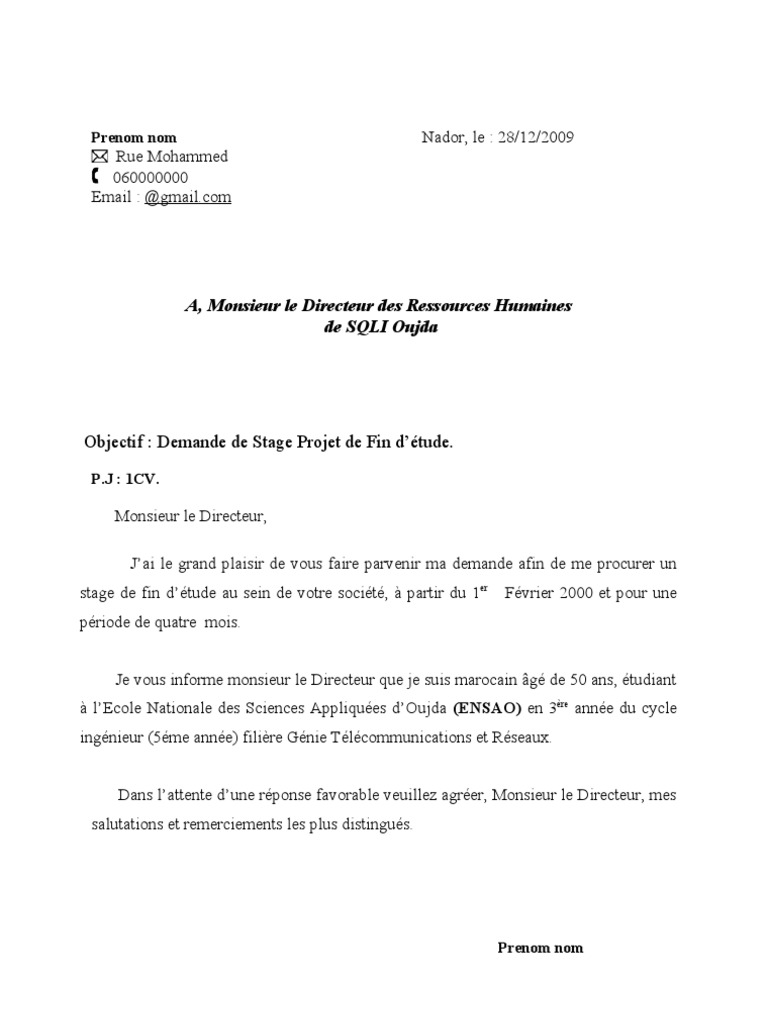 Par exemple, l'esat dans lequel demande de stage monsieur, bien respectueusement, je me permets de vous adresser cet écrit dans l'espoir de bénéficier. Je suis actuellement étudiant à l'université ibn tofail en troisième année, en vue d'obtenir le diplôme de. Written by web share on dimanche 6 novembre 2016 | 15:17. Que ce soit à cause des effectifs, des. Veillez à ne pas faire de fautes d'orthographe dans votre lettre de motivation.